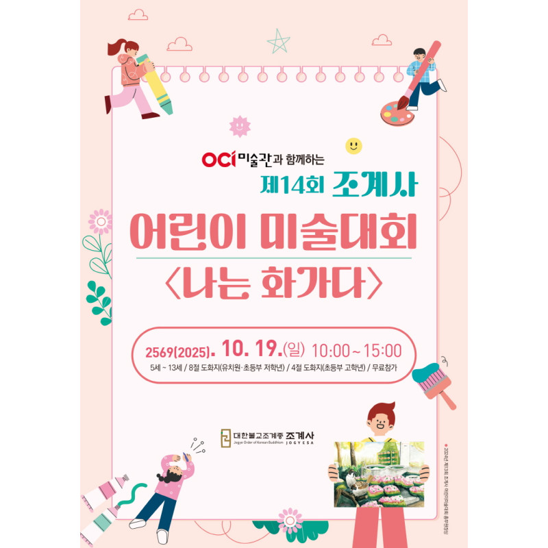 대한불교조계종 조계사가 주최하는 어린이 미술대회<나는 화가다>가 10월 19일 일요일 대한불교조계종 조계사에서 열린다. 어린이들이 도시에서 감수성과 창의성을 펼치고자 여는 즐거운 미술대회이다. 이번 대회에는 동시(시 쓰기), 사진 2개 부문의 '특별참가 코너'가 추가되었다.참가대상은 5세 ~ 13세에 연령으로 8절 도화지(유치원, 초등부 저학년), 4절 도화지(초등부 고학년)로 구분된다. 참가비는 무료이다.미술부문은 자유형식으로 크레파스, 수채화물감, 포스터칼라, 혼합재료등 다양한 재료로 대회에 참가할 수 있고 국화가 피어있는 조계사, 부처님과 나(부제 : 곁에 있는 사람에 대한 고마움)으로 주제어가 발표되었다.시상내역은 대한불교조계종 총무원장상 1인, 문화체육관광부 장관상 1인, 서울특별시장상 1인,동국대학교총장상 1인, 조계사 주지스님상 1인, 조계사 부주지스님상 1인, OCI미술관장상 1인,KB국민카드 사장상 1인, 종로구청장상 1인, 직할교구신도회장상 1인, 조계사 신도회장상 1인, 금상·은상·동상 각 5인, 입선 20은으로 시상동시와 사진 부문은 별도 시상함.[사진출처 : 문화포털 아트인뱅크]문화체육관광부, OCI미술관, 종로구청, 대한불교조계종 직할교구사무처에서 후원한다.문의는 조계사 포교국 02-768-8638이다.기사입력 : 2025.09.22.18:55<임완수 편집국장> artinbank@hanmail.net[ⓒ 문화예술신문 아트인뱅크, 무단전재 및 재배포 금지]