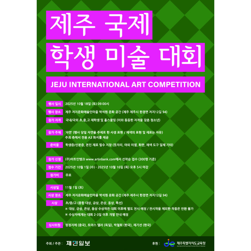 제민일보에서 주최, 주관하는 2025 제주 국제 학생 미술대회가 이번달 18일 오전 9시부터 제주도 저지문화예술인마을 박석원 문화 공간에서 개최된다.국내·외 초, 중, 고등학교 재학생 및 홈스쿨링 및 이와 동등한 자격을 갖춘 청소년이면 누구나 참가 할 수 있다. 대회 공동 주제는 '자연'이다. 행사 장소에서 '자연'을 주제로 한 사생을 표현하면 된다. 채색의 표현 및 재료는 자유이며 모든 학년에 재료에 대한 장르도 구분이 없다. 주최에서 제공하는 화지를 사용하여 주제에 맞게 자유롭게 표현하는 사생대회이다.심사위원은 아시아 활동 대표 작가 및 큐레이터로 구성되었다. 독일, 중국, 한국등 펑정지에(중국), 토마스 엘러(독일), 박철희(한국), 채기선(한국) 심사위원으로 현장에서 심사가 진행된다.대회 수상자에게는 종합대상, 금상, 은상, 동상 특선으로 이뤄지고 시상식에는 시상 및 수상자 전시 또한 이루어 진다.[출처-문화포털 아트인뱅크]접수 방법 : (주)문화포털 아트인뱅크(https://artinbank.com)에서선착순 접수(300명 기준) *제주지역 우선배정 30%접수 기간 :2025년10월1일(수) ~ 10월16일(목)오후5시 마감대회 장소 : 제주도 저지문화예술인 마을 박석원 문화공간9제주 제주시 한경면 저지 12길 94)기사입력 : 2025.10.01.13:31<정수연 선임기자> suyun.jung@gmail.com[ⓒ 문화예술신문 아트인뱅크, 무단전재 및 재배포 금지]