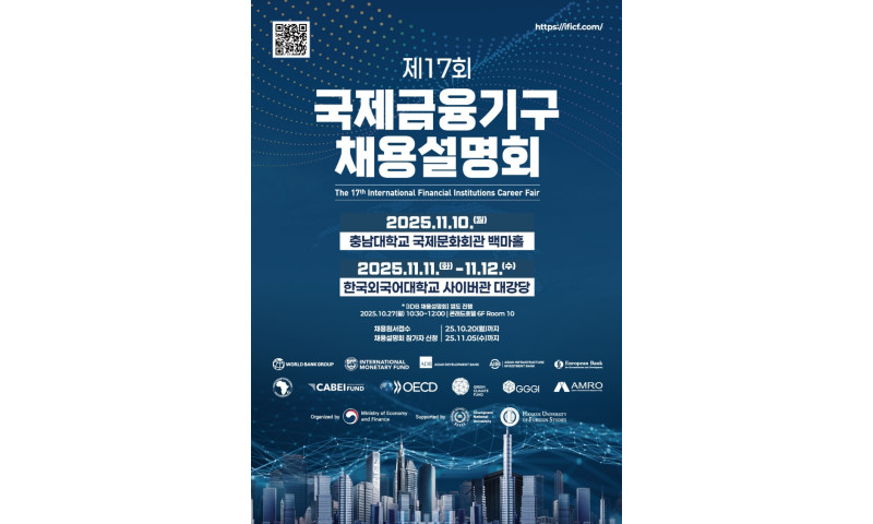 국제기구 취업문 열렸다…기재부, ‘제17회 국제금융기구 채용설명회’ 개최<세계은행·IMF·OECD 등 11개 국제금융기구 참여…IDB 별도 채용설명회도 진행>【츨처=아뱅뉴스】기획재정부는 오는 10월부터 11월까지 ‘제17회 국제금융기구 채용설명회’와 ‘미주개발은행(IDB) 채용설명회’를 개최한다고 9일 밝혔다. 이번 행사는 세계은행(WB), 국제통화기금(IMF), 경제협력개발기구(OECD) 등 주요 국제금융기구가 한국을 직접 방문해 인재를 채용하기 위해 마련됐다.기획재정부에 따르면 국제금융기구에 근무할 경우 높은 수준의 연봉과 외교관 신분 여권, 소득세 면제, 주거·의료비 지원, 자녀 학자금 지원 등 다양한 혜택이 제공된다.■ 제17회 국제금융기구 채용설명회채용지원은 10월 2일(금)부터 10월 20일(월) 밤 12시까지 진행된다.지원 대상은 국제금융기구 취업을 희망하는 대한민국 국민 누구나 가능하며, 대학 재학생, 졸업예정자, 경력자, 해외 유학생도 포함된다.참여 기관은 ▲세계은행그룹(WBG) ▲IMF ▲아시아개발은행(ADB) ▲아시아인프라투자은행(AIIB) ▲유럽부흥개발은행(EBRD) ▲아프리카개발은행(AfDB) ▲중미경제통합은행(CABEI) ▲OECD ▲녹색기후기금(GCF) ▲글로벌녹색성장기구(GGGI) ▲아세안·한중일 거시경제조사기구(AMRO) 등이다.지원은 공식 홈페이지(http://ificf.com에서 최대 3개 국제기구까지 가능하며, 영문 이력서(CV)와 각 기구별 요구서류를 제출해야 한다.채용 절차는 서류 지원 → 서류 심사 → 11월 12일(수) 면접 심사 → 최종 채용 순으로 진행된다.채용설명회는 11월 10일(월) 충남대학교 국제문화회관 백마홀, 11월 11일(화)~12일(수) 한국외국어대학교 사이버관 대강당에서 열린다.면접은 11월 12일(수) 한국외대에서 진행되며, 충남대 면접 일정은 추후 확정된다.일반 참가자는 **11월 5일(수)**까지 사전등록을 하면 현장에서 ‘국제금융기구 채용 가이드북’을 받을 수 있다.■ 미주개발은행(IDB) 채용설명회미주개발은행(IDB) 채용지원은 **10월 2일(금)부터 10월 20일(월)**까지 진행된다.면접은 10월 27일(월)~29일(수) 사이 진행되며, 10월 27일(월) 콘래드호텔 6층 10번 방에서 채용설명회가 열린다.면접은 콘래드호텔(27~28일)과 한국수출입은행(29일)에서 각각 진행될 예정이다.서류심사를 통과한 지원자는 웹사이트 공지사항을 통해 합격 여부와 면접 일정을 확인할 수 있다.기획재정부 관계자는 “국제금융기구 인사 담당자들이 직접 방한해 채용정책과 실제 채용 과정을 설명할 예정”이라며“국제무대에서 활동하고자 하는 청년·전문인력에게 좋은 기회가 될 것”이라고 말했다.<참고>홈페이지:http://ificf.com지원 가능 기관: 최대 3개주요 일정 - 지원기간: 10.2(금)~10.20(월) - IDB 면접: 10.27(월)~10.29(수) - 국제금융기구 면접: 11.12(수) - 설명회: 11.10~11.12