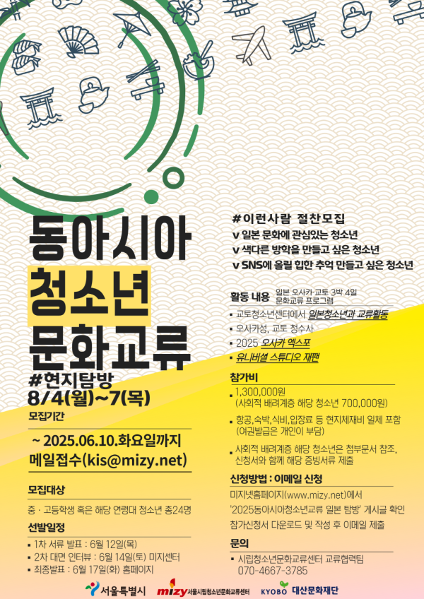 2025년 8월 일본 오사카·교토 일대에서 3박 4일간 진행 오사카·간사이 엑스포, 유니버설 스튜디오 등 다채로운 문화체험 예정 청소년 문화교류를 통한 동아시아 청소년 간 상호이해 및 세계시민 의식 함양