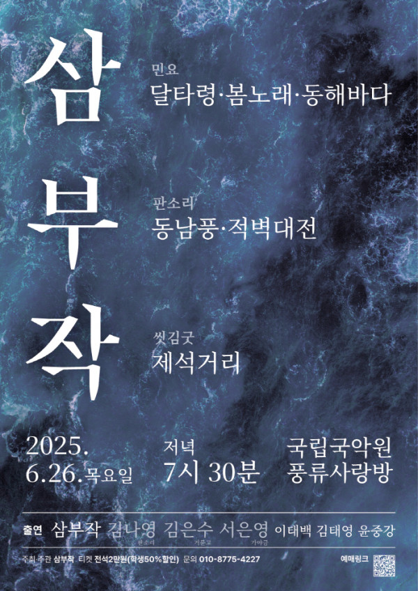 오는 6월 26일(목) 오후 7시 30분 국립국악원 풍류사랑방에서 국악계 여성 예술가 3인이 펼치는 새로운 무대가 열린다. ‘삼부작(三部作) - 남도소리로 세 갈래의 작품을 그리다’는 각기 다른 전통악기를 다루는 세 연주자가 ‘남도소리’라는 공통의 재료를 중심으로 민요…