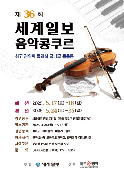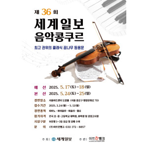 세계일보에서 주최하고 아트인뱅크에서 주관하는 제36회 '세계일보 음악콩쿠르' 예선이 성황리에 마무리가 되었다.각부문별 고등부 1등 100만원, 2등 50만원, 3등 30만원 과 중등부, 초등부 또한 순위별로 상금이 지급된다.총상금이 1,350만원이다. 이번예선을 통과해…