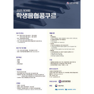 한국음악협회에서는 오는 2025년도 7월30일부터 학생음협콩쿠르는 개최한다.예선과 본선으로 나눠실시한며 접수시작은 6월16일(월)부터 7월 7일(월) 오후 4시까지 접수가 이뤄진다.수상한 학생들에게는 서울특별시장상, 국립국악원장상, 한국음악협회 이사장을 수여할 예정이다…