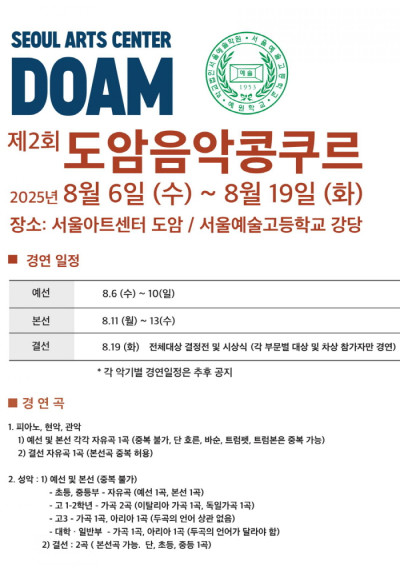 서울예술학원(예원학교, 서울예술고등학교), 도암이대봉재단이 후원하는 서울아트센터 도암음악콩쿠르가 제2회를 맞이한다. 2025년 8월 6일에 시작하여 예선, 본선이 8월 19일까지 경연이 치뤄진다. 도암음악콩쿠르에 참가자격은 초, 중, 고등학생과 대학…