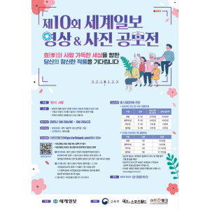 세계일보에서는 매년 실시하는 영상&사진공모전이 '효,사랑'의 주제로 이번달 6월 20일(금)까지 영상 및 디지털사진을 공모한다. 총상금은 1,500만원 규모의 영상(개인 또는 팀)12명에게는 1,020만원, 디지털 사진(개인) 7명에게 480만원의 시…