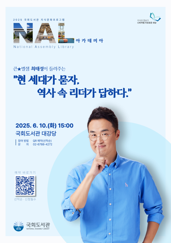 국회도서관, '2025 지식문화프로그램-NAL 아카데미아' 개최- 6월 10일(화) ‘큰별쌤’ 최태성 초청 강연에 여러분을 초대합니다 -- 11월까지 차인표·이낙준·백윤학 등 각 분야 대표 연사 강연·공연 예정 - 국회도서관(관장 황정근)은 오는 …