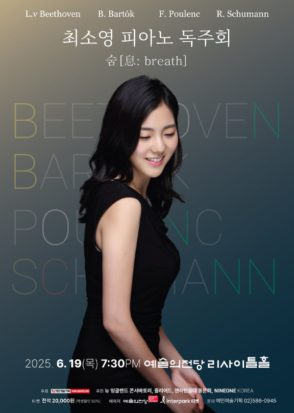 피아니스트 최소영 독주회가 이번달 6월 19일(목) 19:30분에 예술의전당 리사이틀홀에서 열린다. 후원에는 뉴 잉글랜드 콘서바토리, 줄리어드, 맨하탄음대 동문회, NINEONE KOREA이다. '영혼을 울리는 타고난 음악성을 지녔다'고&n…