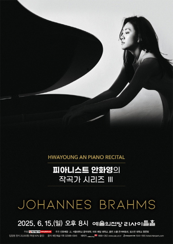 피아니스트 안화영은 이번달 6월 15일(일) 오후 8시 예술의전당 리사이트홀에서 작고가 시르즈 III 을 공연한다. 이번 공연 후원은 선화예중·고, 서울대학교 음악대학, 미국 예일 대학교, 콜번 스쿨 콘서바토리, 보스턴 대학교 동문회가 후원…