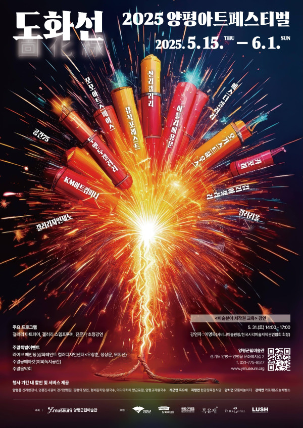 2025 양평아트페스티벌 (도화선;예술로 꽃피우는 희망의 불씨) 양평군립미술관에서 제1회 양평아트페스티벌이 2025년 5월 15일(목) ~6월 1일(일) 16일간의 양평지역 주요 갤러리와 미술간이 초청한 서울 지역 갤러리들이 연합하여 아트페어 형태의 전시와 부…